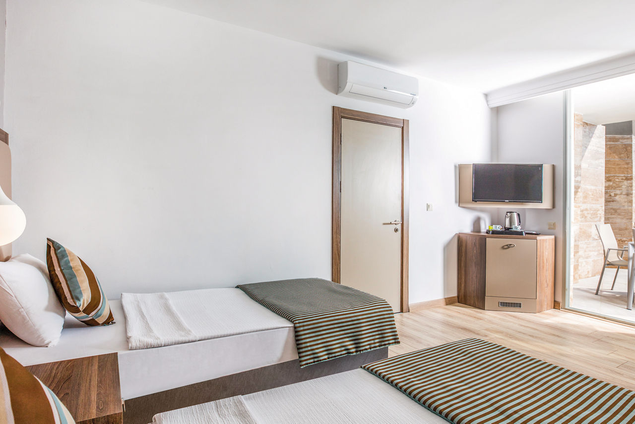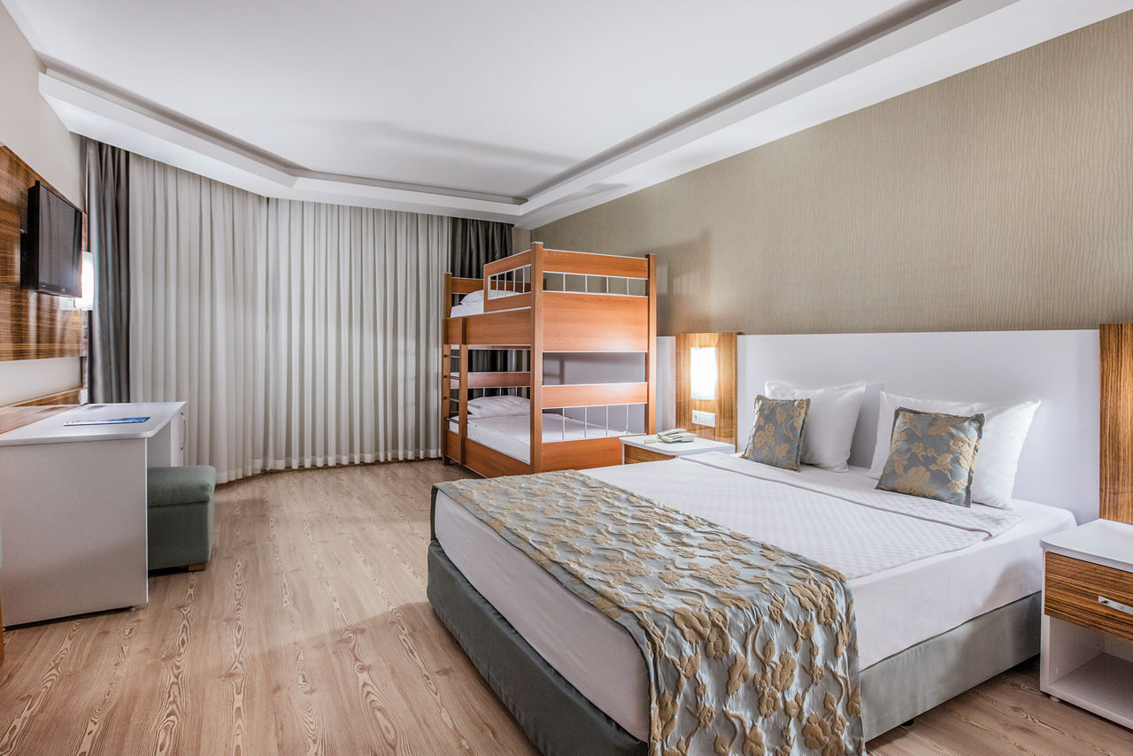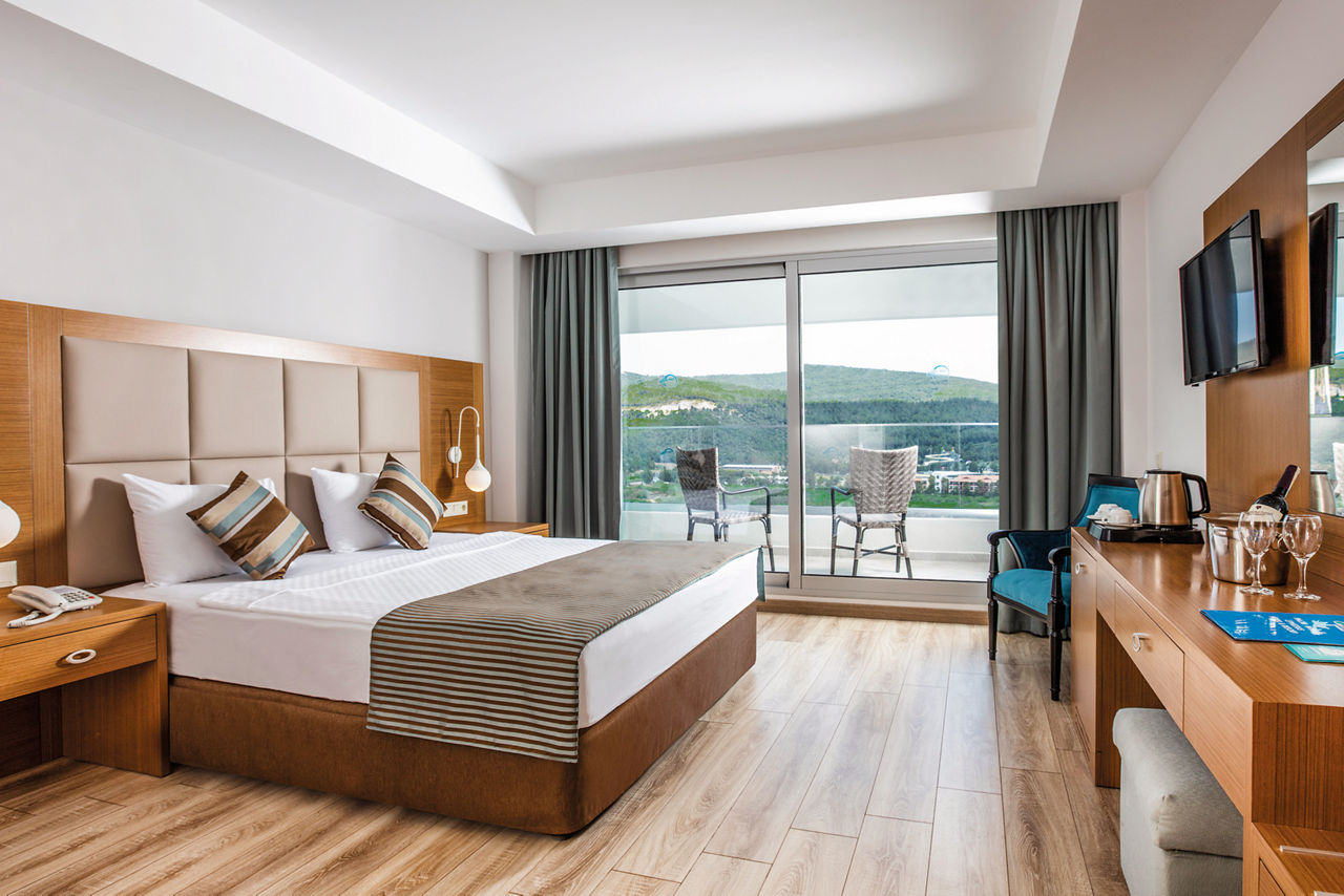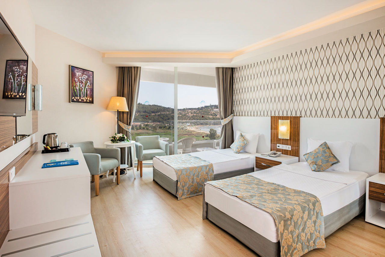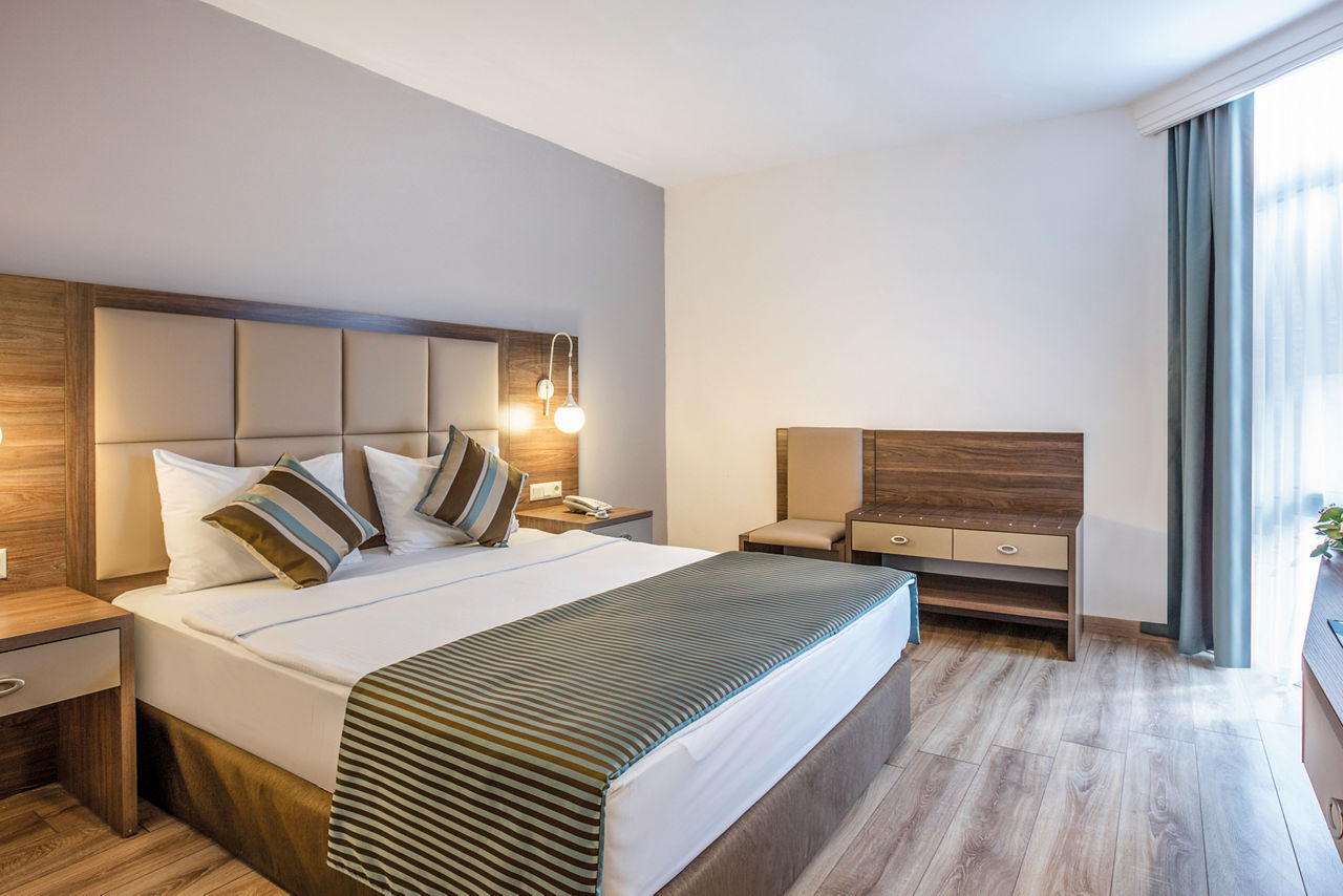 There's something for all the family at Palm Wings Ephesus Beach Resort. This place does terrific Turkish getaways to a tee, with modern, spacious rooms, four outdoor pools, a splash park and a beautiful beachfront location. And better still - when you're on All Inclusive Plus as standard, mealtimes couldn't be more of a doddle. Sit down to dine and six restaurants will be ready to serve everything from local to Mexican dishes! A whopping seven bars means grabbing a cocktail or a coffee on the hop are both easy. Enjoy the enriching spa and range of sports activities, while the kids will love the children's club, choice of waterslides and play areas!Standard Double rooms in the Main Building sleep up to 3 adults and have bathroom, hairdryer, air conditioning (depending on weather), television, kettle and balcony.