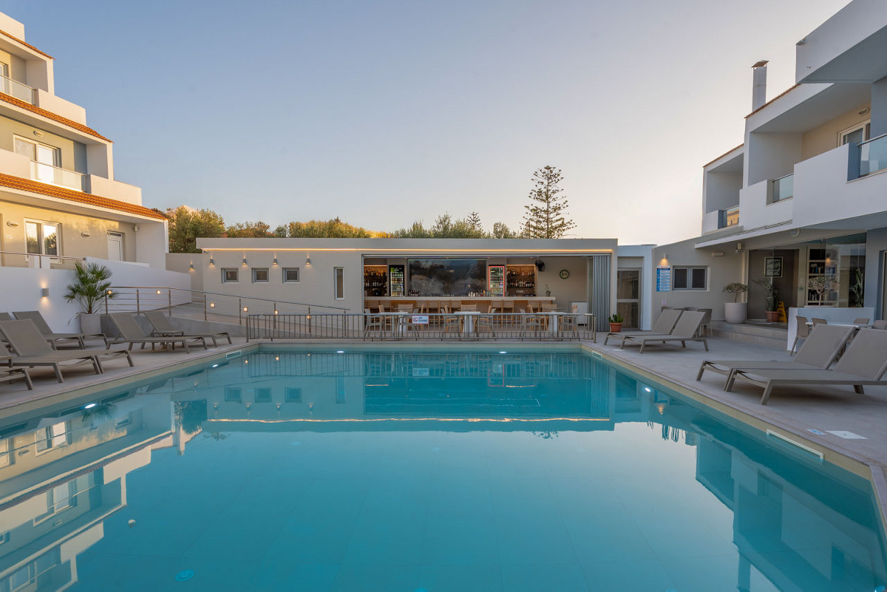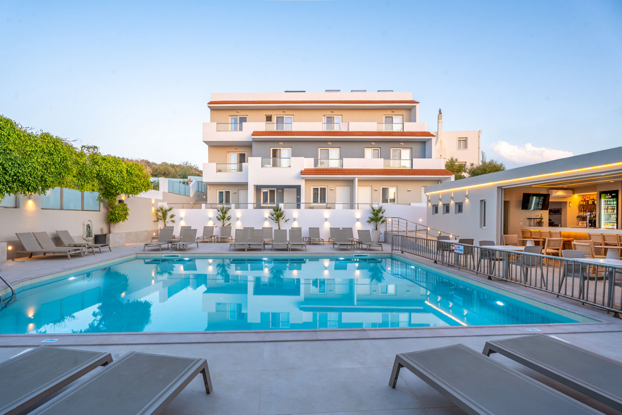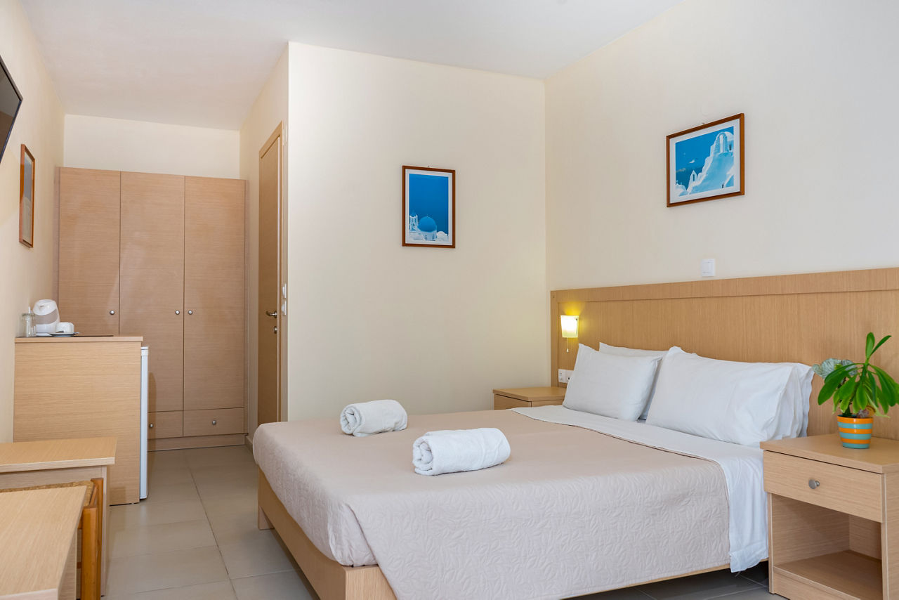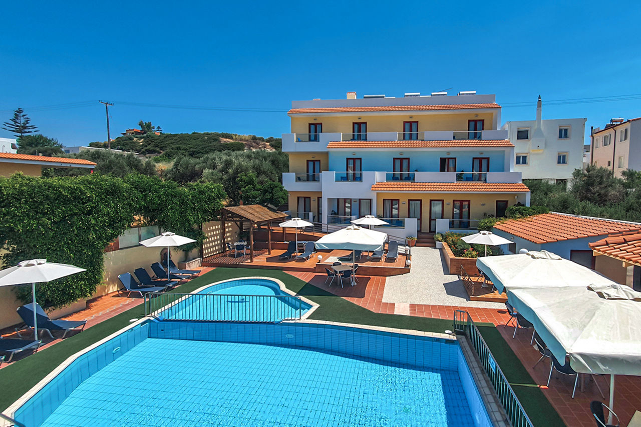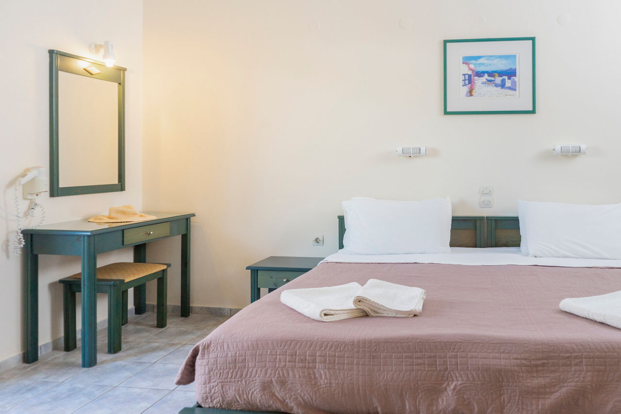 This family run hotel offers a great laid back friendly feel in a peaceful location. Complete with a pool and pool bar and only 200m from the beach and the family run Thalassi beach Restaurant. The restaurant has a menu full of local Cretan dishes, most of which include ingredients grown locally, making this hotel a great choice for those wanting to soak up the sun and the local way of life.Double or Twin rooms sleep 2 adults and 1 child or 3 adults and have air conditioning*, fridge, kettle, satellite TV, full bathroom, hairdryer and balcony or terrace. Family rooms sleeping up to 5 people are also available.