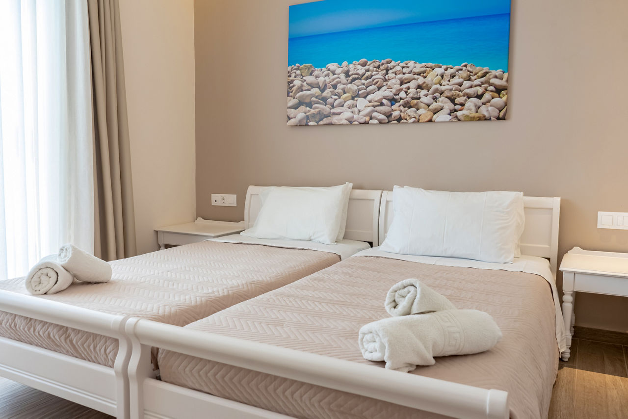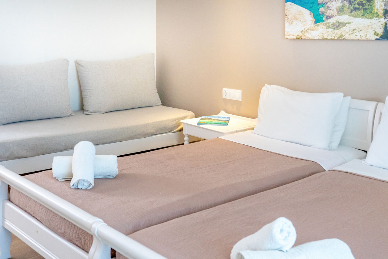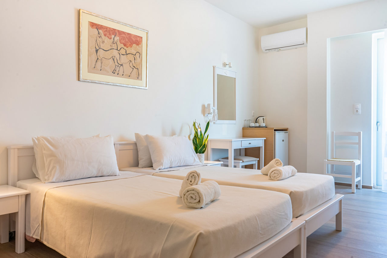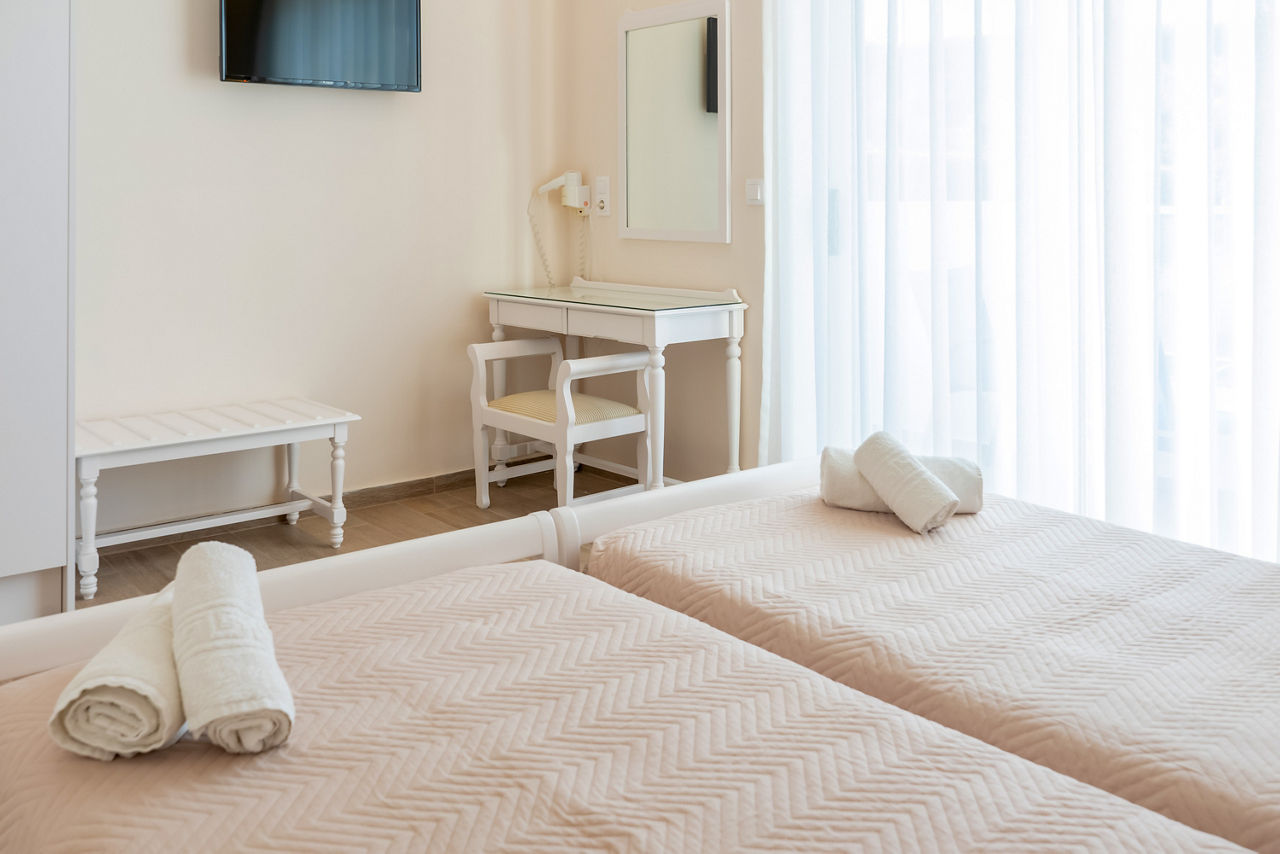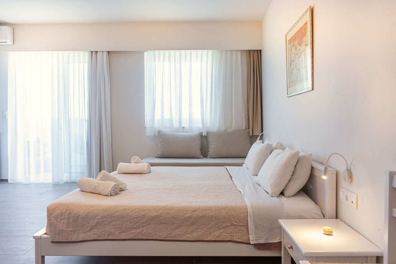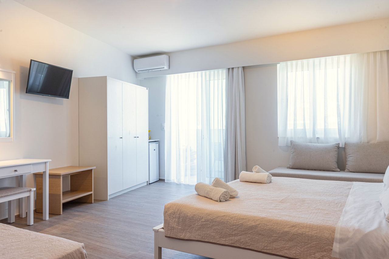 This family run hotel offers a great laid back friendly feel in a peaceful location. Complete with a pool and pool bar and only 200m from the beach and the family run Thalassi beach Restaurant. The restaurant has a menu full of local Cretan dishes, most of which include ingredients grown locally, making this hotel a great choice for those wanting to soak up the sun and the local way of life.Double or Twin rooms sleep 2 adults and 1 child or 3 adults and have air conditioning*, fridge, kettle, satellite TV, full bathroom, hairdryer and balcony or terrace. Family rooms sleeping up to 5 people are also available.