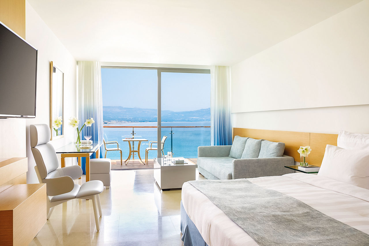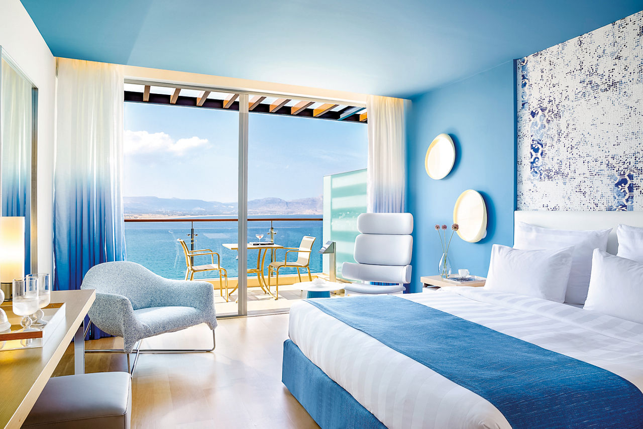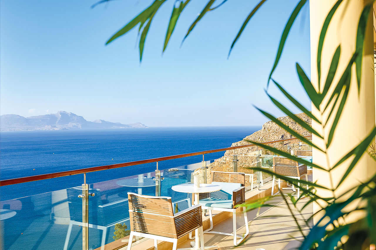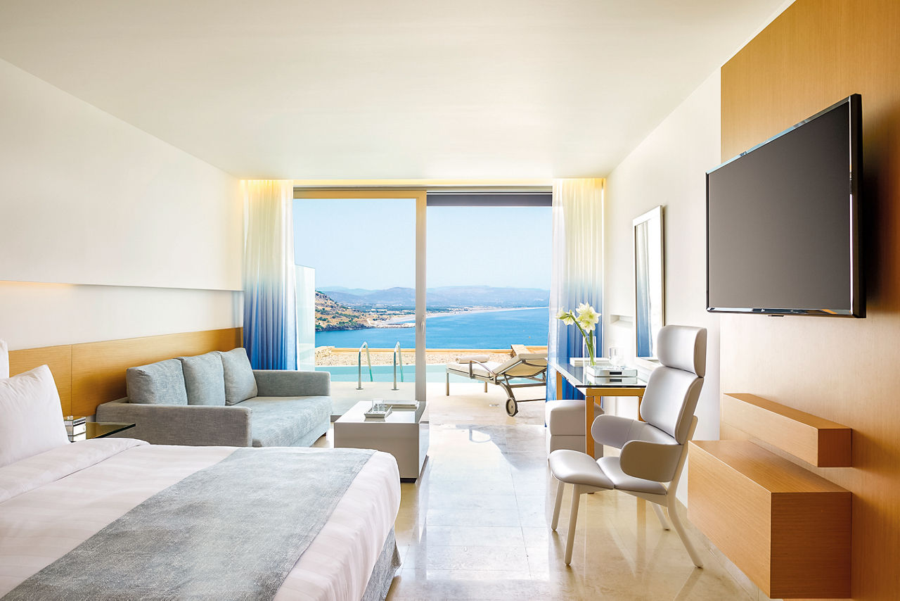 Set against the Aegean Sea and chiselled from the picturesque rocks, Lindos Blu Luxury HotelSea view rooms have air-conditioning, flatscreen TV, DVD and MP3 player, mini-bar*, bathroom with whirlpool bath and separate shower, bathrobes and slippers and balcony or terrace with sea view. Junior suites with sitting area and larger balcony, Deluxe room with outdoor whirlpool, Junior suites with shared pool, Villas with Private Pool and Maisonettes with Private Pool are also available.