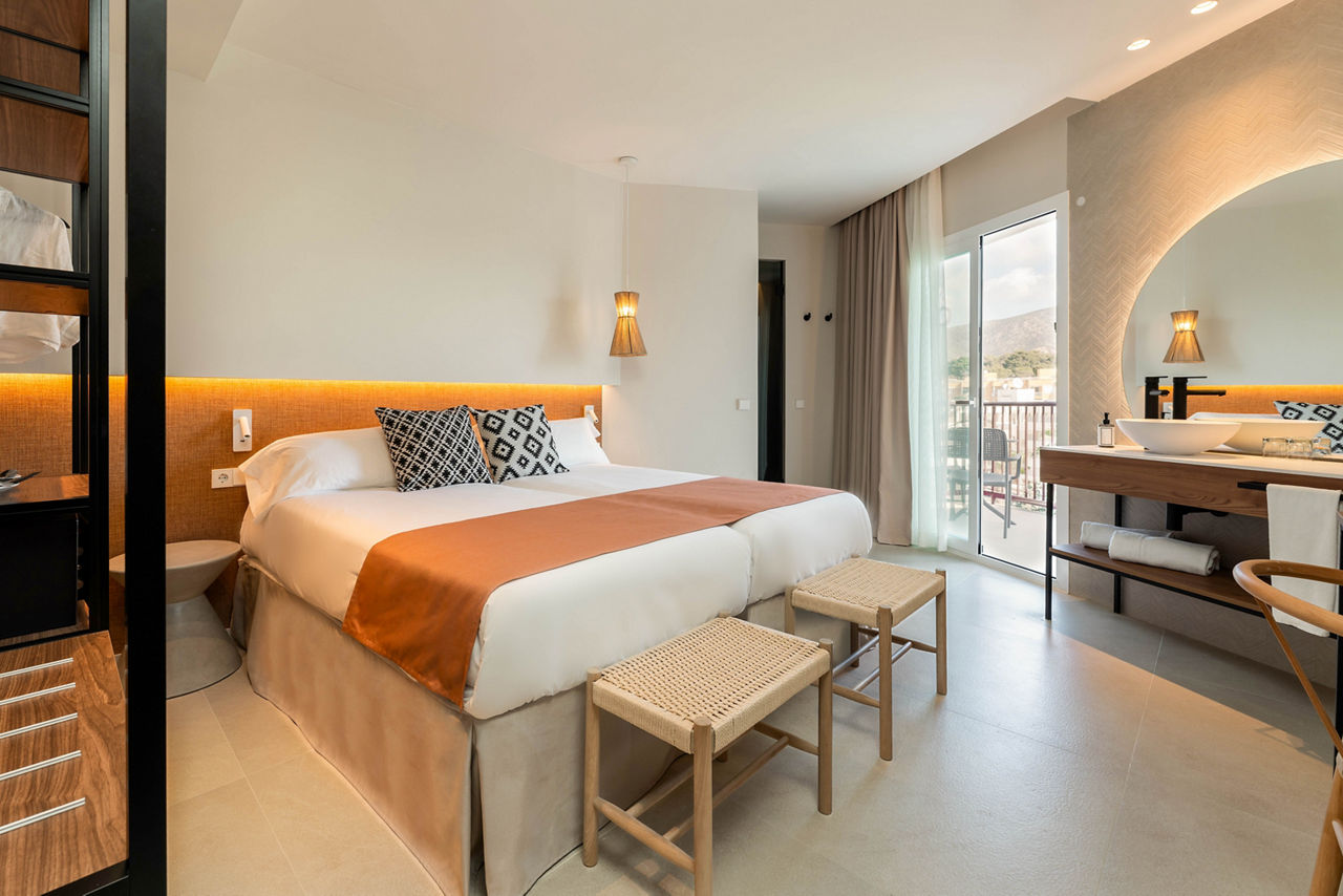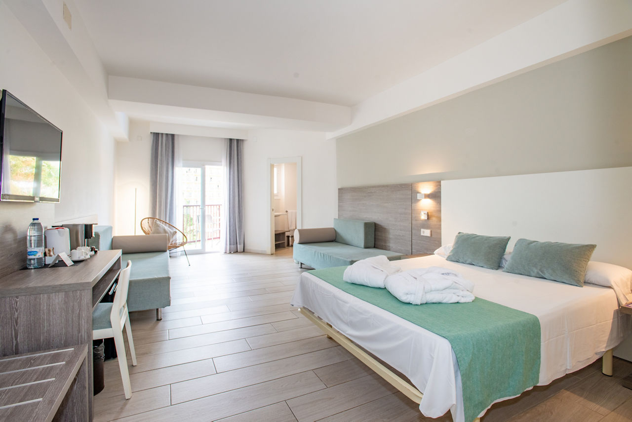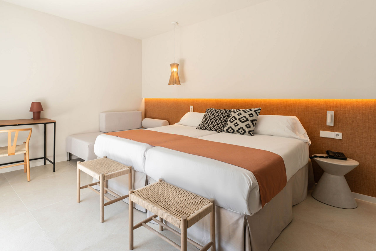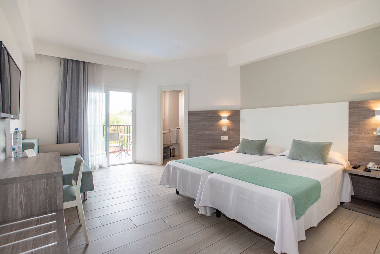 With palm-filled grounds and a modern feel, the FERGUS Bermudas is a lovely choice. One of its best bits? The fantastic location, just a short stroll from the beach. Stick to the hotel and you?ll have a large swimming pool area to enjoy, plus there?s a children?s club for the little ones. Go for the All Inclusive option and you can enjoy great value for money from the buffet restaurant and two bars. The lively heart of Palma Nova is just 200m away, so you?ve got oodles of bars and restaurants right on your doorstep!Twin rooms sleep up to 3 adults and have bathroom containing a bath or shower, air conditioning (01 May-31 Oct), hairdryer, flat screen television, safety deposit box* and balcony. Twin rooms with Pool View, Junior suites and Sole Use rooms are also available.