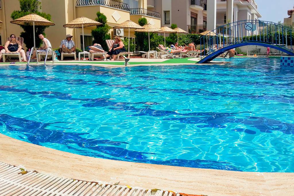 Outdoor swimming pool surrounded by a pool terrace with sun loungers and umbrellas.Marianna Studios