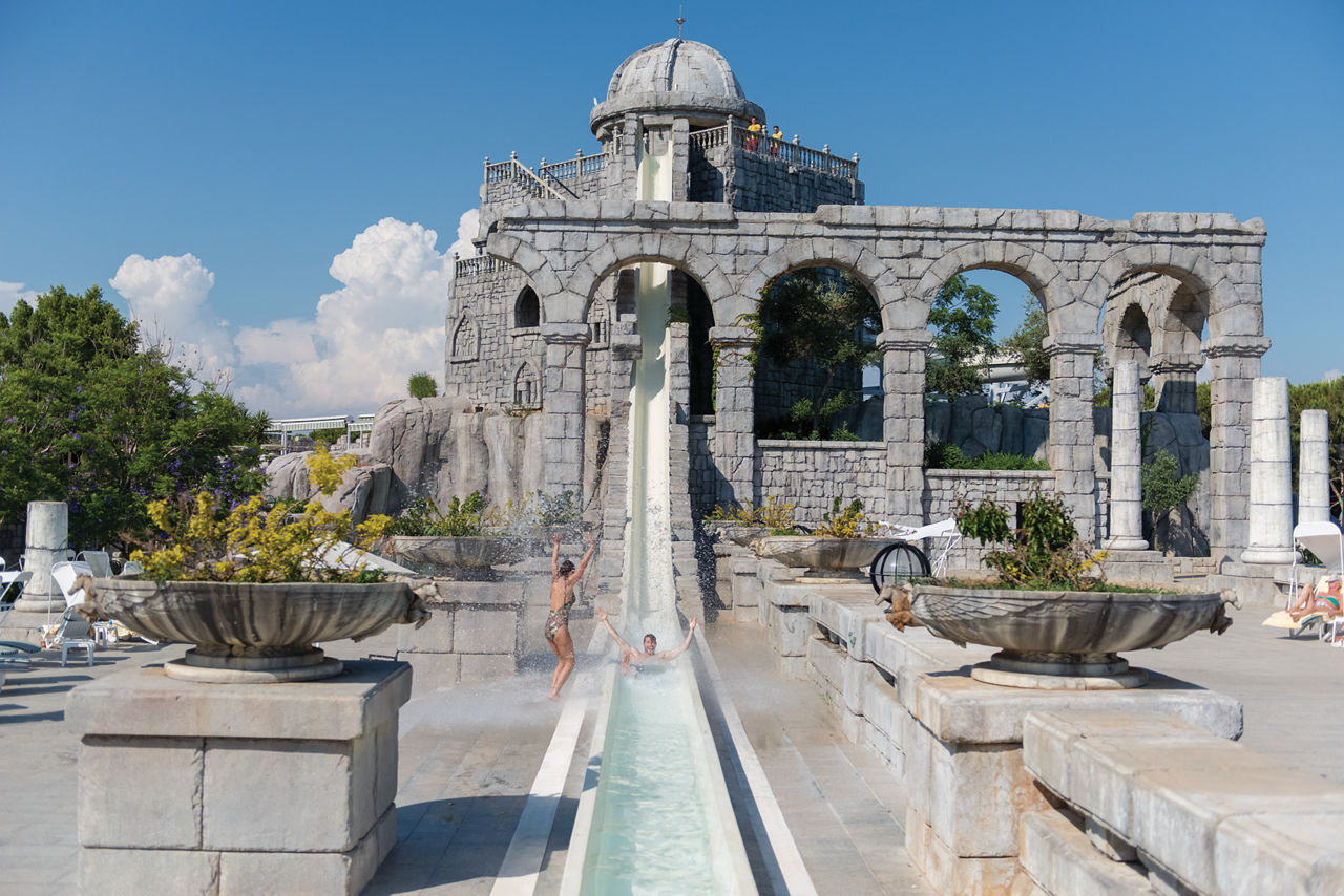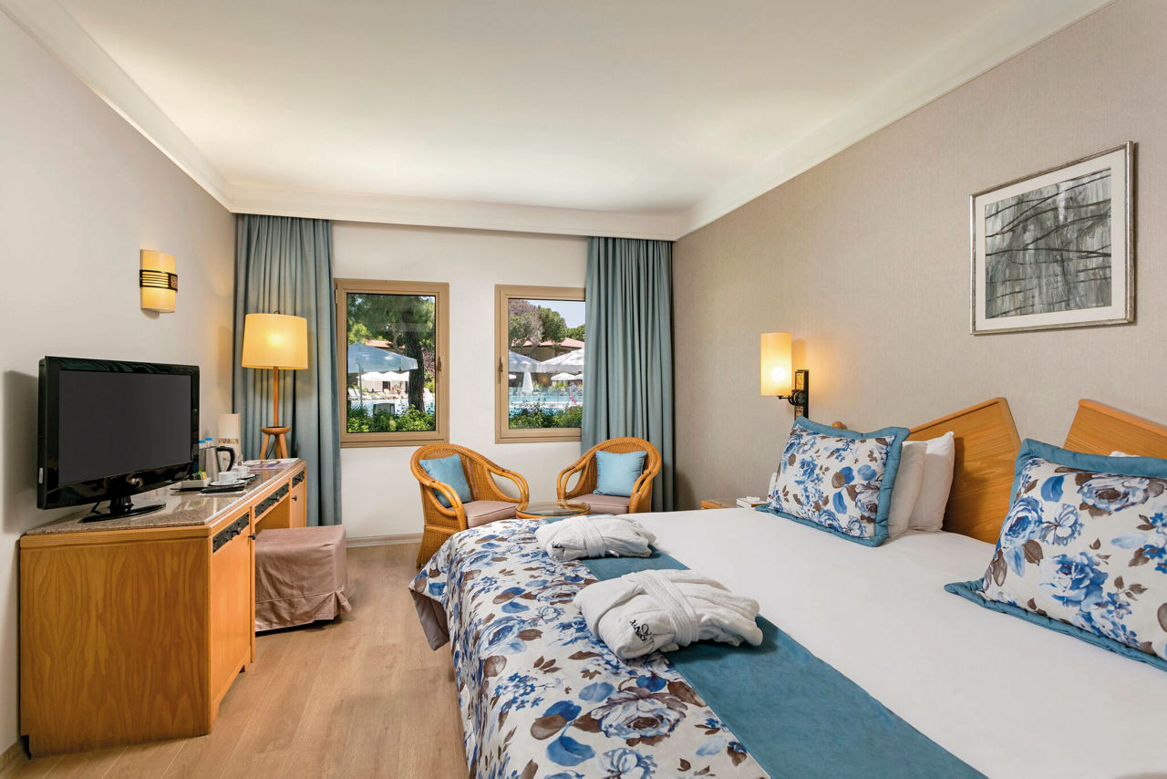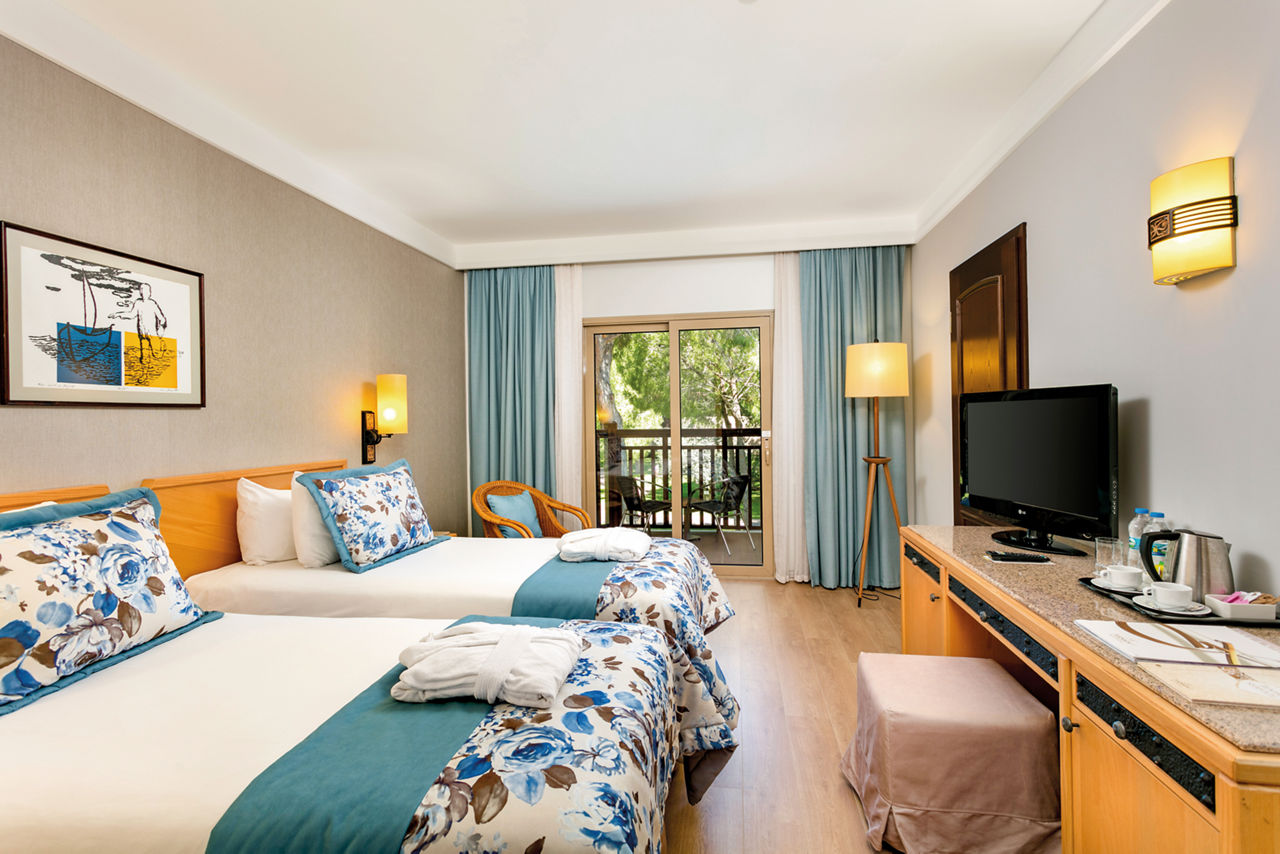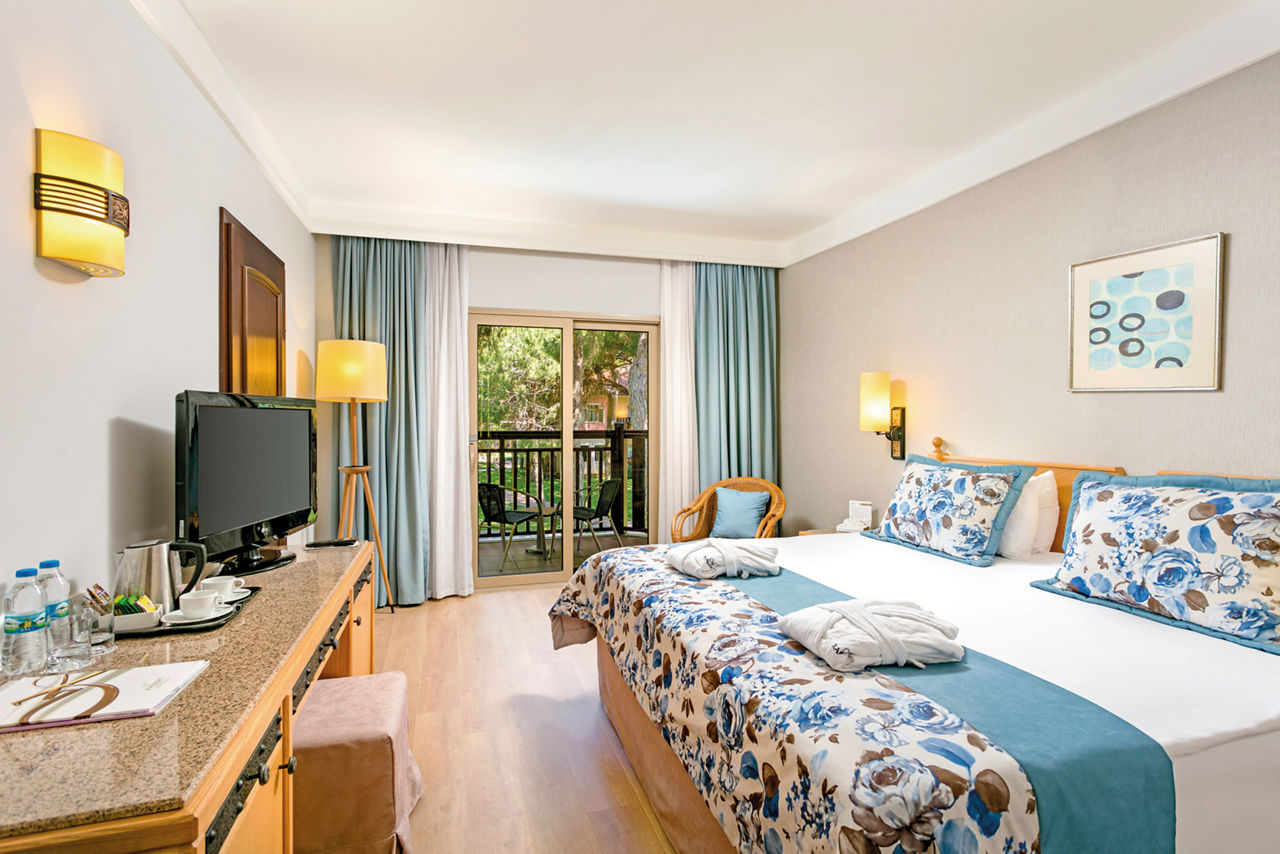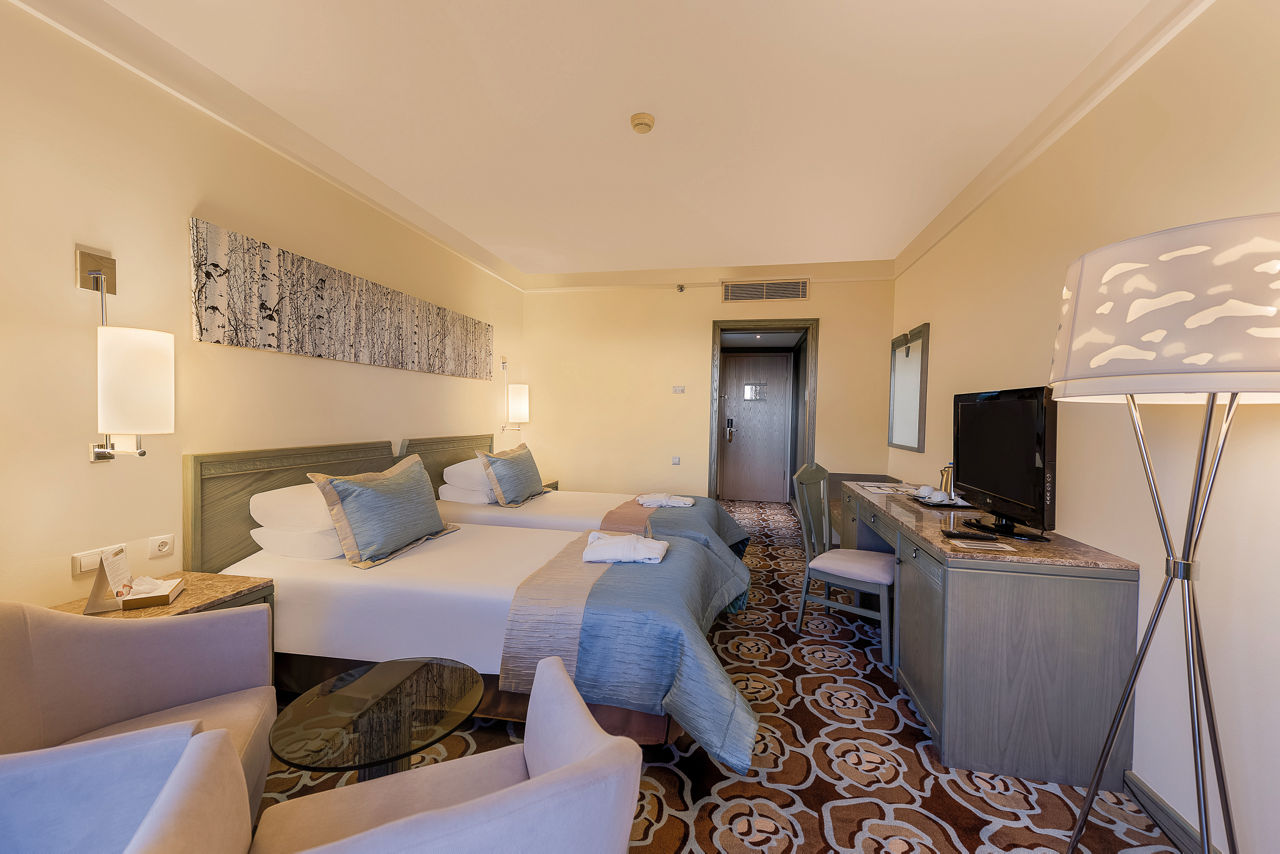 From the ancient Roman-themed pool area and thrilling waterslides, to the impressive rainbow coloured Fancyland Kids' World including splash park, funfair, climbing wall, adventure park, kid's restaurant, mini amphitheatre and children's club, the Xanadu Resort Hotel Belek is an excellent choice for a fun-filled family holiday. There's the beautiful beachfront location with a whopping 415m of golden sand, a pier and a beach club, and an abundance of restaurants and bars you can sample on 24 hour All Inclusive Plus. Adults are also not forgotten with an adults only cocktail bar, adults only beach section, and the luxurious 3350m? Shang-Du Spa which offers a haven of peace and relaxation. What a clear winner for your next all inclusive family getaway!Standard Double and Twin rooms in the Main Building sleep up to 3 adults and have bathroom containing a bath, air conditioning, hairdryer, bathrobe and slippers, flat screen television, safety deposit box, free Wi-Fi, coffee making facilities and balcony. Room Upgrade options sleeping up to 6 adults and Sole Use rooms are also available.