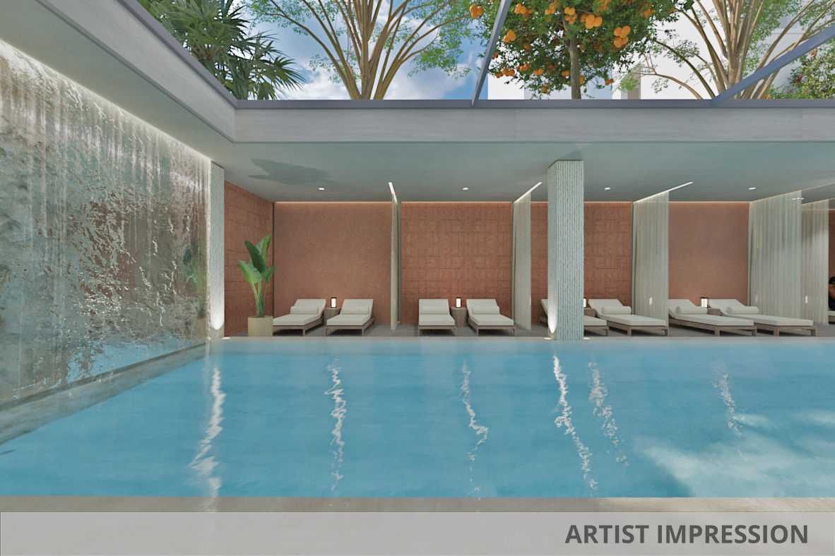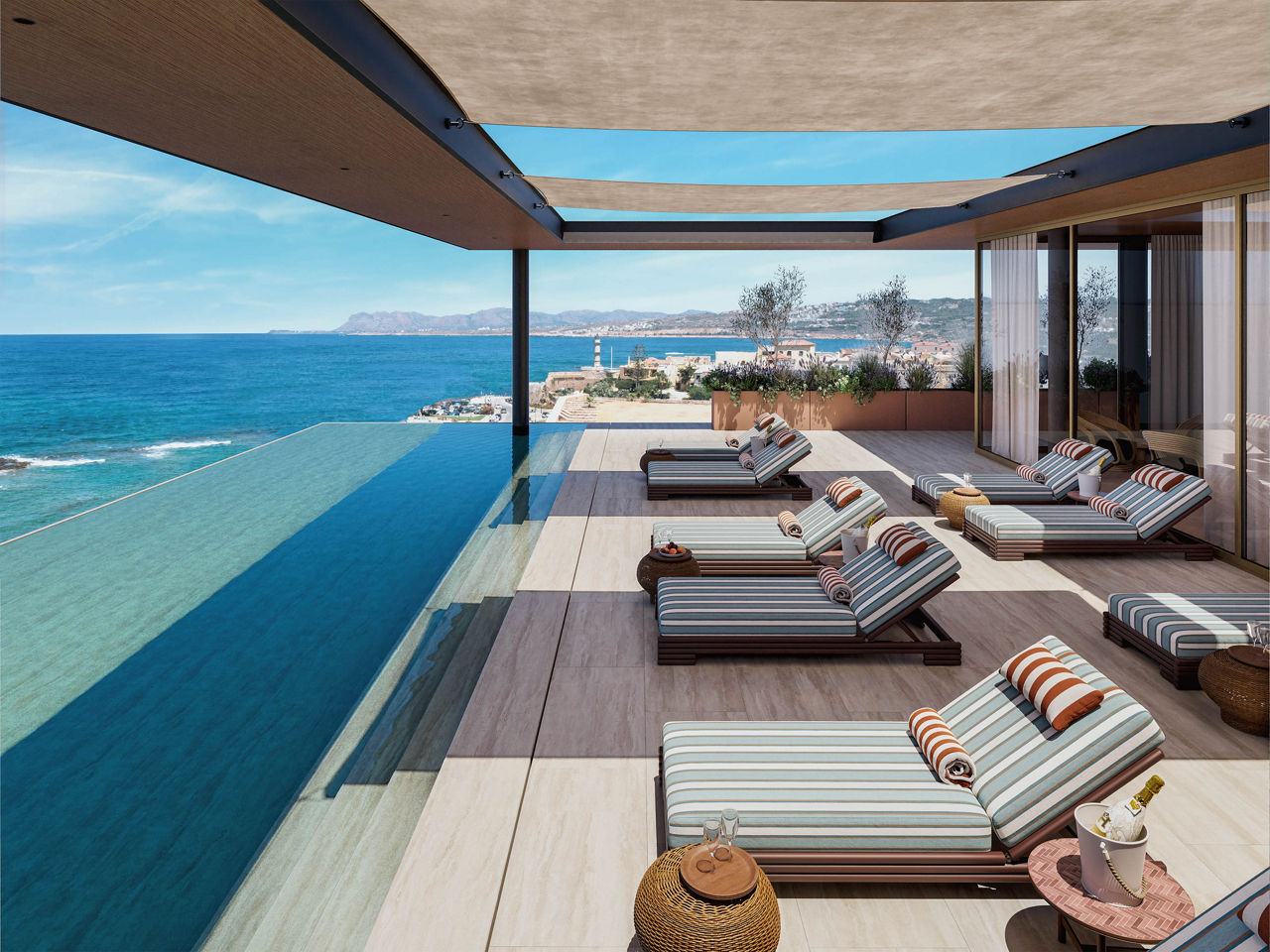 First floor rectangular swimming pool and sun terrace with loungers and lovely views out to sea.BelleVue Belsana
