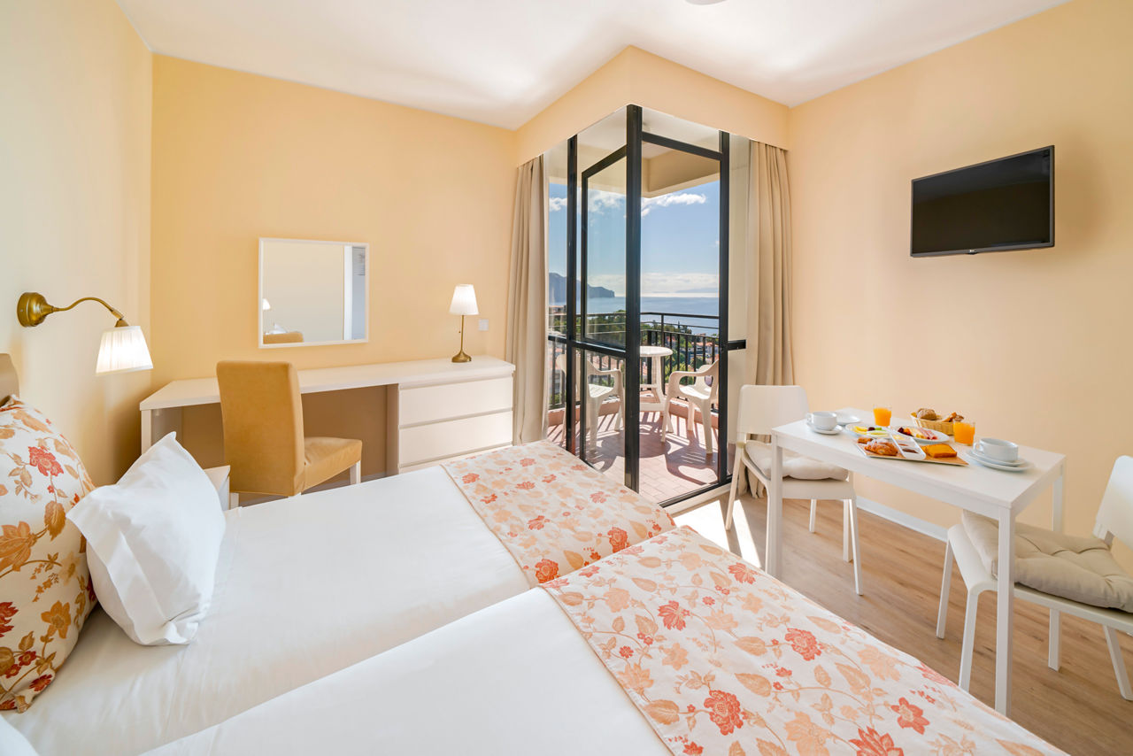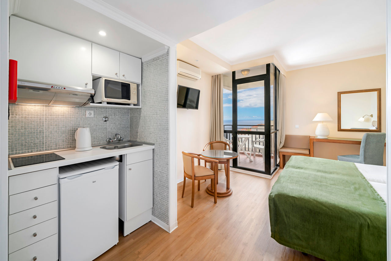 If you are looking for comfort and great value, the Hotel Dorisol Mimosa is the ideal option for your Madeira getaway. Not far from the well-known Lido promenade, the hotel has a number of bars and restaurants close by to get you out and about in Funchal. Venture further and you will reach Funchal?s city centre with a host of historic sight and cobbled streets to work your way around. With plenty to do outside of your hotel, you will be happy to get back to your studio for a comfortable rest. On days you want to kick back, there is an outdoor and an indoor pool to choose from or have a go at getting active on the tennis court. The friendly staff are on hand to give you a warm welcome, making your stay that little bit easier. So, for a convenient base in this fabulous city, the Hotel Dorisol Mimosa ticks all the boxes.Studios sleep up to 3 adults and have bathroom containing a bath or shower, hairdryer, television, double cooking rings, fridge and balcony.
