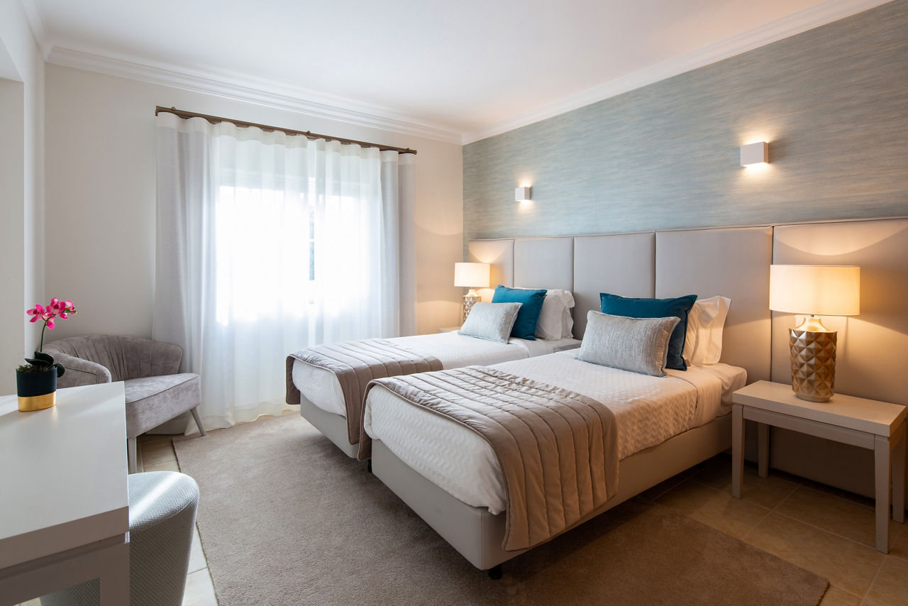 Set in flourishing gardens close to some of the finest beaches and golf courses in the Algarve, the Vale d?Oliveiras is an elegant five-star hotel and resort which is perfect for a luxury getaway. The Monchique hills are the backdrop to this magnificent landscaped resort, and the resort's ecological gardens are ideal for a romantic scenic walk in the morning or for a leisurely bike ride in the afternoon. Children will love to pack their summer holidays with activities and the Vale d'Oliveiras will provide fun games and animal shows to fascinate and tire them out by night. The traditional townhouses are the ideal choice for families and come with spacious living rooms, fully equipped kitchens and the option of a garden or pool view. In the winter, the resort exudes a relaxed atmosphere where you can feel at home with a fireplace in your townhouse. The Olive Tree Restaurant is a highlight for the resort with locally sourced ingredients creating a variety of culinary delights, and the panoramic view will add to your breathtaking experience. The Vale d'Oliveiras Quinta ResortStandard Double and Twin rooms without Balcony sleep up to 2 adults and have bathroom containing a bath with shower attachment, hairdryer, bathrobe and slippers, air conditioning, flat screen television, coffee making facilities, mini-bar* and safety deposit box. One Bedroom townhouses sleeping up to 3 adults and 1 child, Two Bedroom townhouses sleeping up to 5 adults and 1 child, Two Bedroom townhouses with Pool View and Double and Twin rooms for Sole Use are also available.